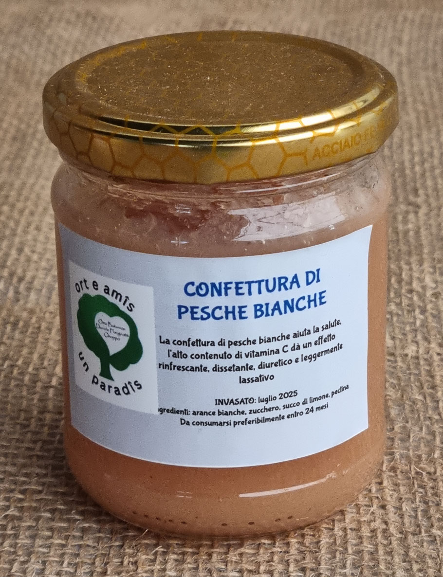 La composta di pesche bianche, è una conserva dolce e vellutata, caratterizzata dal sapore delicato e profumato della pesca bianca, che si distingue per la polpa chiara e morbida. Il suo aspetto è quello di una purea densa, ma con la possibilità di trovare ancora dei pezzetti di frutta, e il suo colore tende al bianco avorio. Gli ingredienti principali sono le pesche bianche, zucchero e succo di limone, ma esistono varianti che usano mele per addensare o che sono completamente senza zuccheri aggiunti.