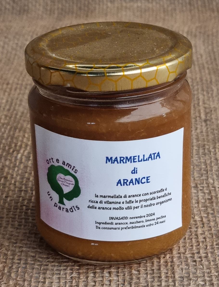 La marmellata di arance, è un preparato dolce e aromatico, fatto con arance e zucchero, che si distingue per il suo sapore che unisce la dolcezza della polpa a una leggera nota amara e rinfrescante della scorza. La sua preparazione avviene tramite la cottura di arance tagliate a fette, a volte con aggiunta di scorze, zucchero e succo di limone, fino a ottenere una consistenza densa e un'aromatizzazione intensa. È ideale per la colazione, spalmata su pane o fette biscottate, ma si abbina bene anche a formaggi freschi e stagionati, e come ripieno per dolci